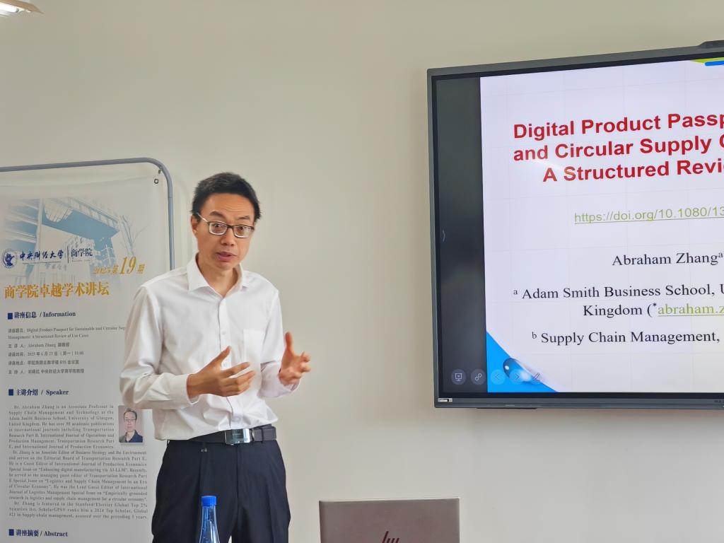 Abraham Zhang副教授本次讲座的主题为“数字产品护照在可持续与循环供应链管理中的作用:基于用例的结构化综述”。他围绕欧盟最新循环经济行动计划中的关键监管要素——数字产品护照(DPP),探讨了其在提升产品可追溯性、供应链透明度以及资源循环利用方面的潜力。讲座首先概述了DPP在政策与实践中的现状,随后基于对82个DPP供应链用例的结构化综述,系统分析了DPP在增强供应链可持续性和循环性方面的功能价值。基于综述结果,Abraham Zhang副教授讨论了DPP赋能可持续与循环供应链管理的理论与实践意义,并提出了该新兴研究领域优先考虑的研究需求,为与会者提供了深刻的学术启发。