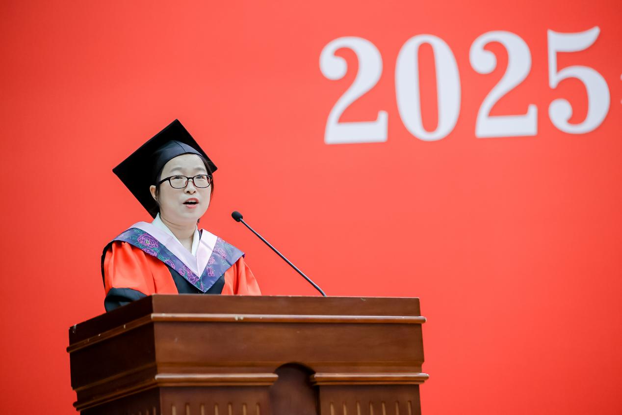 组织与人力资源管理系嵇月婷老师作为教师代表发言。她引用“大压缩理论”,指出在当下时代,个人价值公式已发生改变,决定个人价值的或许不再是单一技能的深度,而是驾驭多元性的自由度。她希望同学们毕业后拓宽视野,掌握多元技能,凭借好奇心成为拥有无限可能的“超级个体”。此外,她认为人生真正的追求应是简单而幸福的生活。她引用“Never enter a room without been heard”这句话,鼓励女性同学无论身处何种场合,都自信勇敢地表达自己,去打造属于自己的美好人生。