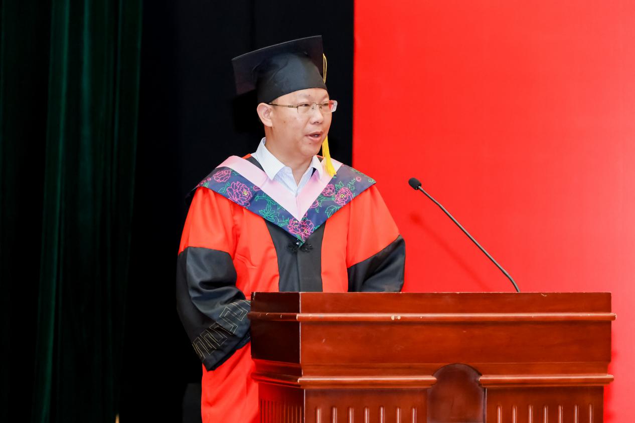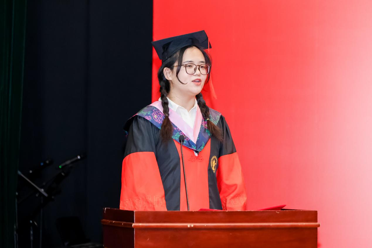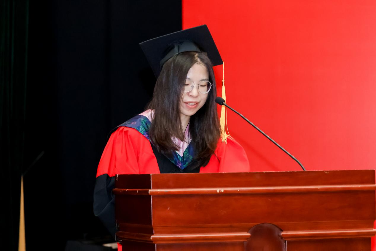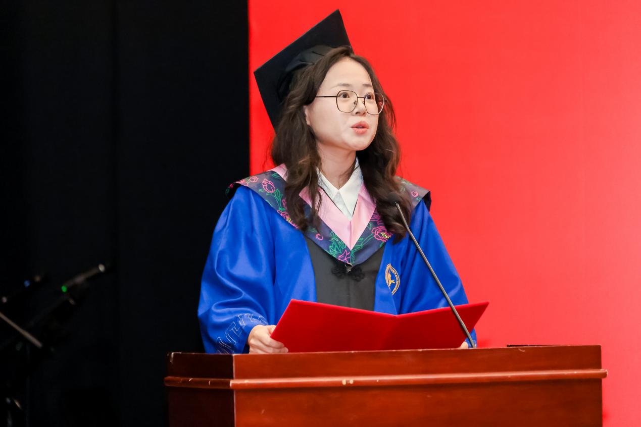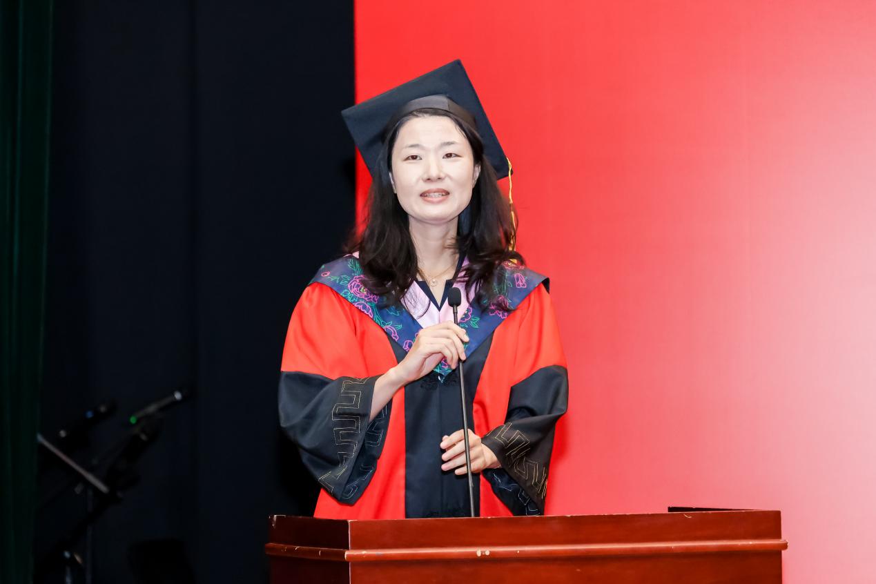 博士毕业生姜福斌作为员工代表发言。她首先恭喜博士生同学们如愿应答“你什么时候毕业”的灵魂拷问。她表示这一路收获的不仅是知识,更是勇于质疑、不断创新、不折不挠的科研精神。借用导师的一句话“严谨的态度让人无懈可击,科学的方法让人无往不克”,她倡导大家未来无论投身何项事业,都要以校训为指引,用脚踏实地的行动和开拓创新的思维,为社会创造更大价值。最后,她祝愿大家前程似锦,鹏程万里,不忘初心,砥砺前行。
