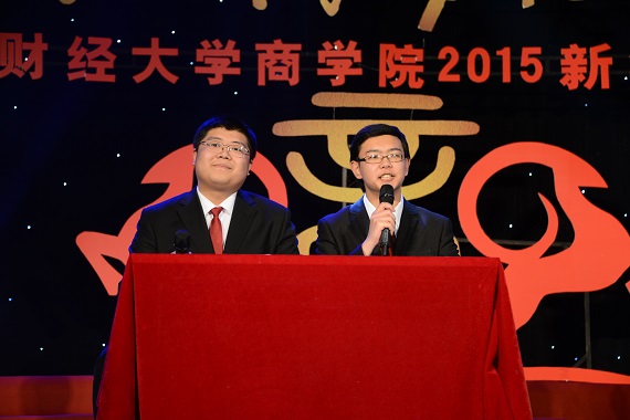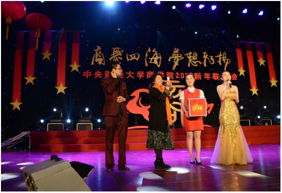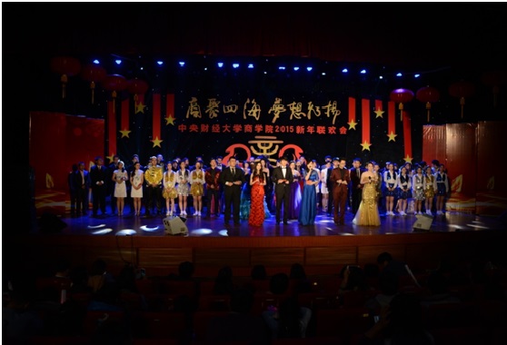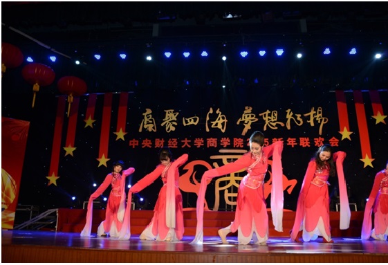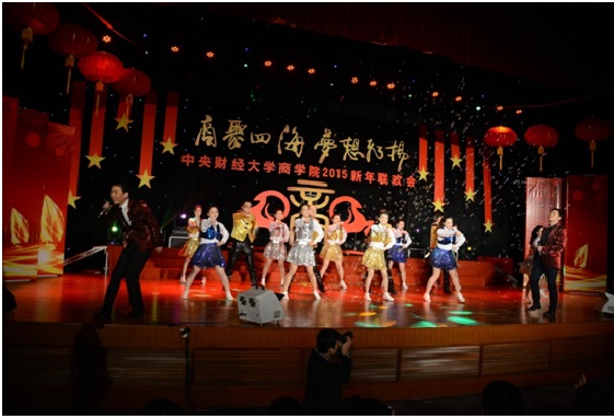 联欢会在MBA员工带来的活力四射、热情洋溢的歌舞《超级英雄》拉开了序幕,热情尚未散去,本科、研究生以及员工、老师轮番上台,用精彩纷呈的歌曲串烧为观众奉上音乐盛宴。诗朗诵《商院人》情深意切,相声《中财新闻联播》诙谐风趣,古典舞蹈《咏春》《桃夭》,惊为天人,美轮美奂;动感T台秀,历届商院员工在动感的乐曲中展现着自信、青春的姿态,为观众送去新年祝福。宛转悠扬的独唱《幸福山歌》、精妙绝伦的弦乐四重奏让观众沉醉其中,员工独唱《改变自己》、《再回首》令人喝彩,回味无穷,爆笑的脱口秀《百家笑谈》、引人入胜的魔术以及舞台剧《中财好声音》更是获得掌声不断、欢笑连连,将现场的气氛推向了高潮。