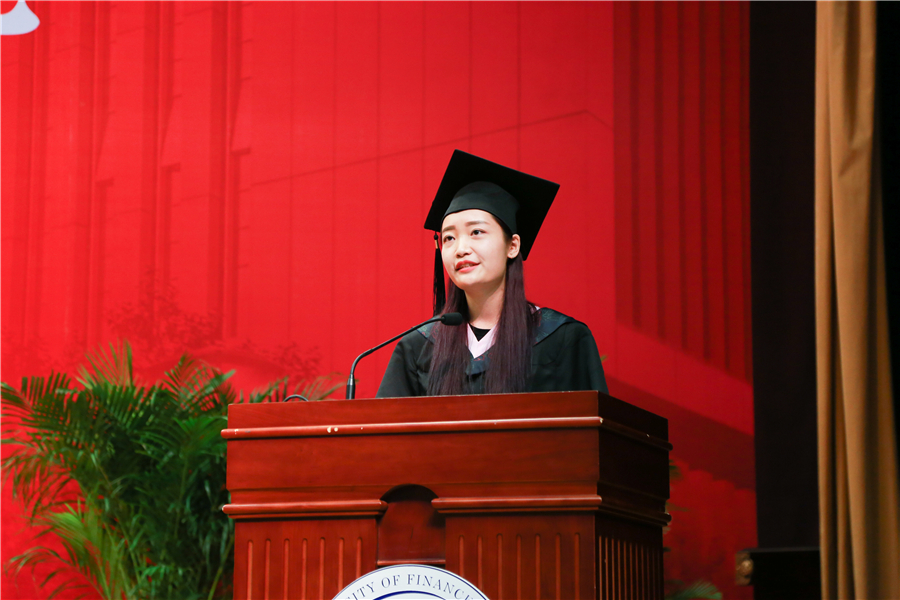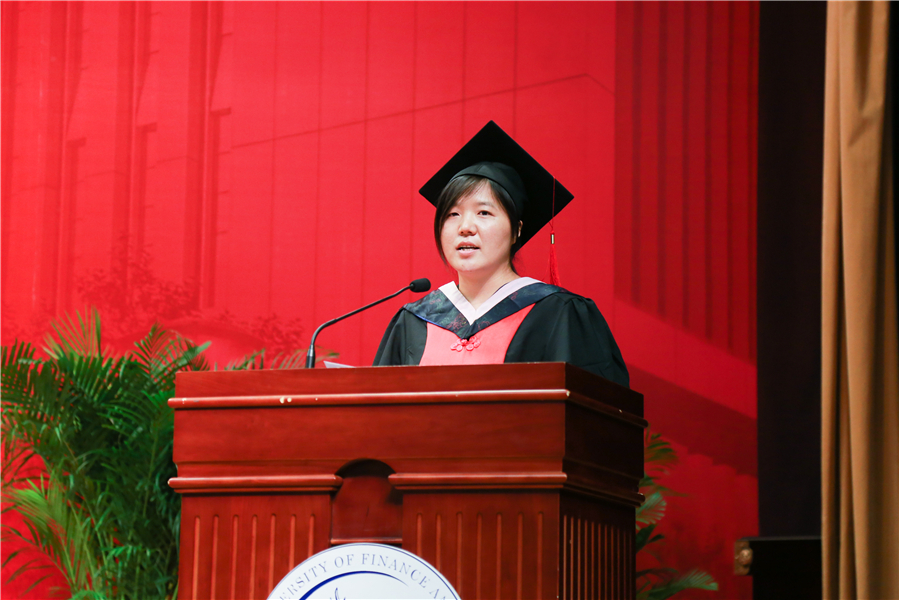 2012级本科生曾戬媛、2014级学术性硕士生蕾拉、2014级MBA硕士生殷丽莉、2013级博士生韩慧林分别作为毕业生代表发表了毕业感言。代表们回顾了难忘的校园生活,衷心感谢老师们付出的心血和汗水,感谢同学们彼此之间的关爱和帮助,感谢亲友们在自己求学之路上的支持!他们表示,作为中财的毕业生,他们一定自觉担负起时代赋予的历史重任和光荣使命,秉承母校“忠诚、团结、求实、创新”的校训,牢记老师们的谆谆教诲,在今后的工作中谱写新的篇章,创造新的辉煌,以骄人的成绩为母校增光添彩,为实现中华民族伟大复兴的中国梦努力奋斗!来自物流管理专业的曾戬媛同学已被美国俄亥俄州州立大学哥伦布分校录取,她的2012级本科同学中还有30位小伙伴也将分赴海外,前往伦敦政治经济公司、纽约大学、新加坡南洋理工大学等国际知名高校深造;而学术型硕士研究生代表蕾拉则是来自非洲马里共和国的职工,她用流利的中文表达了她对PA视讯官方网站、中财PA视讯集团官网师生友人们的感谢,要将这份真挚的情谊带回她的祖国!
