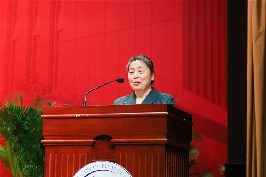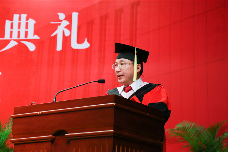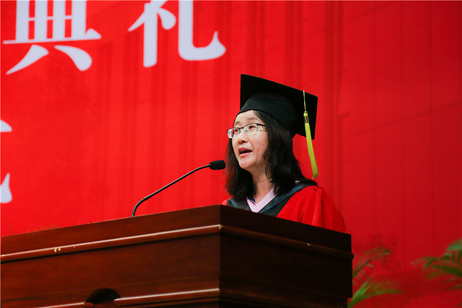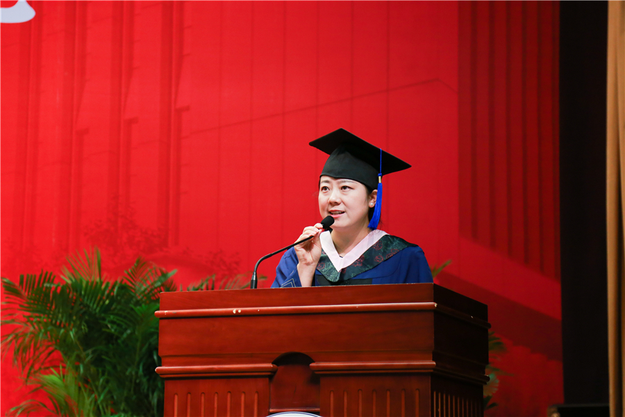 代表教师致辞的张淑君教授今年从教恰满三十周年。她首先感谢同学们选择了在PA视讯集团官网度过了自己人生最美好的青春岁月;随后张教授指出同学们在读书期间难免会有缺憾,但也正是这些缺憾才让人生变得更为完美;最后张教授以“龙马自知征程远,不待扬鞭自奋蹄”激励同学们在今后的学习生活中奋发图强,祝福同学们都拥有伟大的前程!