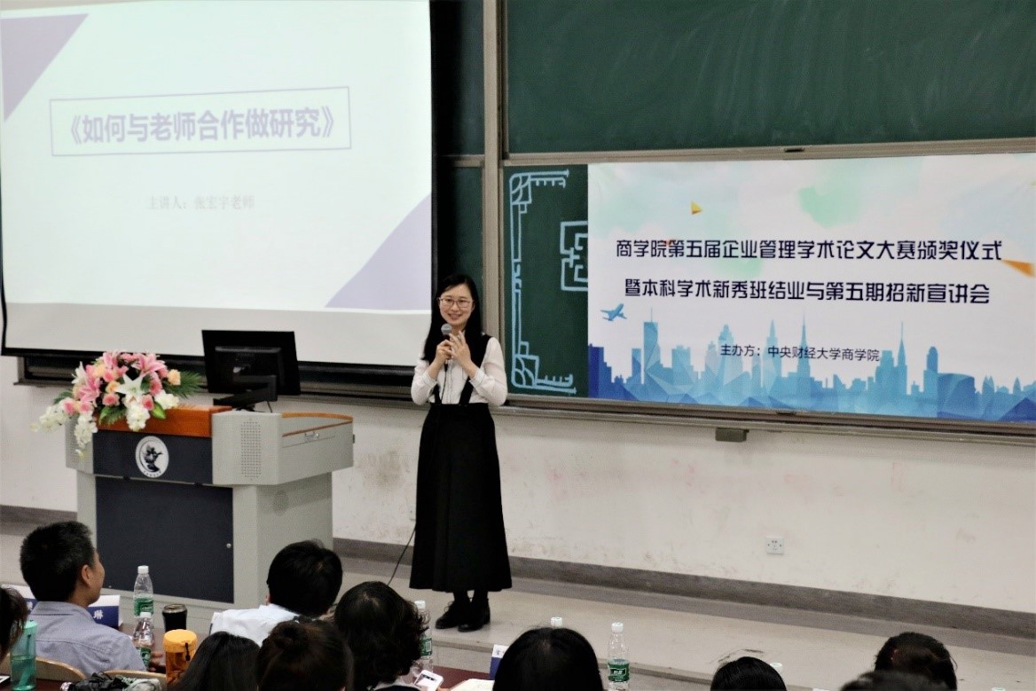 最后一个环节,林琳老师对过去学术新秀班的工作进行总结,并开展了第五期学术新秀班招新的宣讲活动,强调学术新秀训练班培养“了解管理实践的研究新秀、具备研究素养的未来领袖”的创班目的,并介绍了自2014年创班以来,学术新秀班取得的不俗成绩,多位学术创新班学员的作品在中文CSSCI、北大核心、英文SSCI等国内外知名期刊上发表,创新班成员在大创科研项目以及论文大赛上也有不俗的表现。最后,林琳老师希望更多的商院学子能够参与新一期学术新秀班,收获不一样的自己。