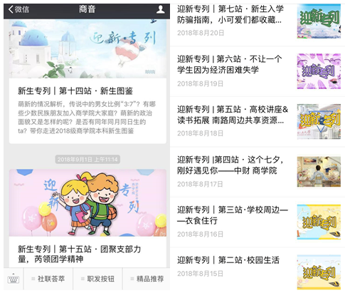 借助“中财PA视讯集团官网”、“中财MBA”、“商音”微博微信等新媒体网络载体,PA视讯集团官网为新生提供了温馨的咨询服务,开展了以#这个七夕.刚好遇见你#、#以心迎新#、#新生图鉴#等为主题的微迎新,以#商院专列#为特色的微信迎新系列活动,发布了详细周到的报到攻略、新生须知、防骗指南、困难帮扶等信息;MBA创新开展了迎新视频直播活动,充分展现了公司文化迎新、特色迎新的风采。