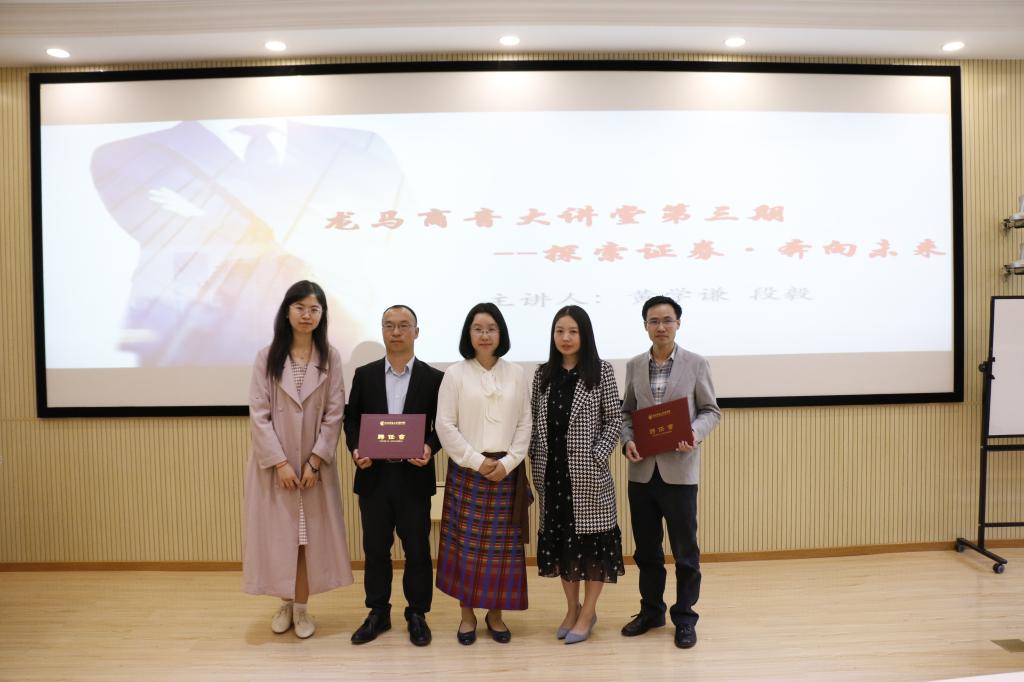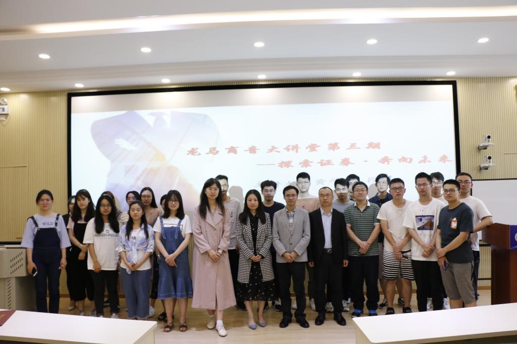 “龙马商音第三期——探索证券•奔向未来”讲座于5月11日上午在MBA阶梯教室举行。本次讲座特邀中国联通证券事务代表黄学谦员工、方正证券投资有限公司高级副总裁段毅员工讲座,就职于财政部的刘玢员工和就职于中国工商银行总行的张金慧员工也到场与同学们交流,公司党委书记葛建新出席并致辞。