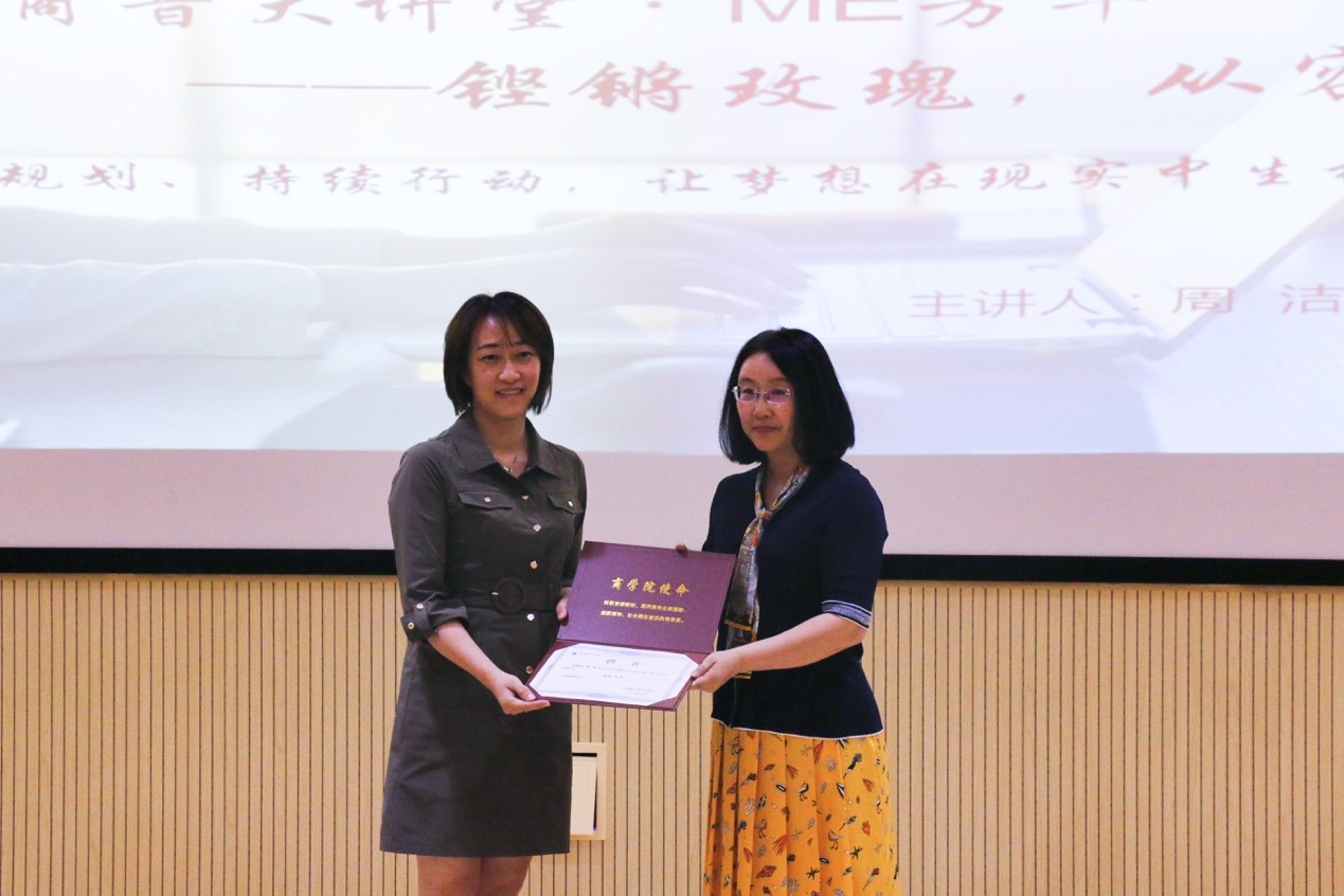 葛老师在致辞中首先感谢员工来校分享。葛老师提到,邀请周洁员工回到母校,分享真实可信的职业经历,与同学们面对面的交流,同时周洁员工的分享主题也十分契合“ME·芳华”系列活动,员工走出中财后的职业选择以及再次进入大学学习的职业经历与感悟能够对在场同学有所启发,同时也对女老员工未来的职业发展进行指导。