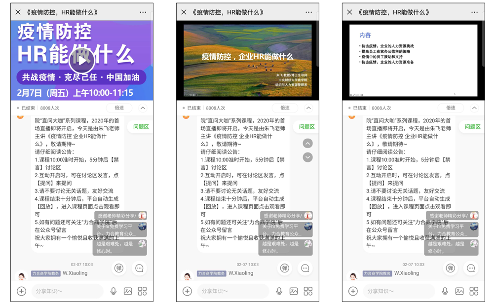 2020年2月7日上午,PA视讯集团官网组织与人力资源管理系朱飞教授在新冠疫情防控期间,利用互联网平台面向全国企业的管理者和人力资源管理人员开设公益直播课程,以“疫情防控期间,企业HR能做什么”为题,为企业提供疫情防控期间和疫情结束之后的人力资源管理实践建议,切实践行研究者的社会责任。超过8000名企业管理者和人力资源管理人员参与了本次公益直播课程。