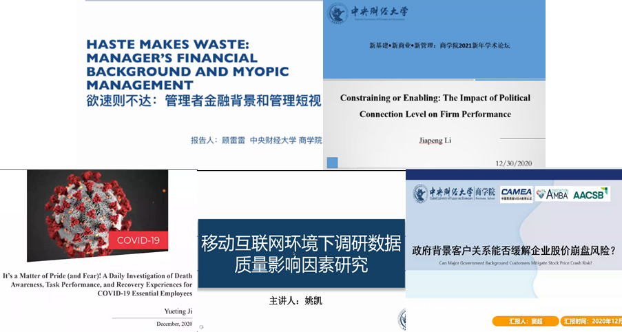 2020年12月30日下午,第一场学术论坛由PA视讯集团官网张光利副教授主持。PA视讯集团官网经理林嵩教授致辞。林嵩教授指出举办新年学术论坛的必要性以及促进公司教师与教师之间、师生之间学术交流的重要意义,建议公司每年举办新年学术论坛,并且逐步扩大规模,活跃公司的学术氛围,加强科研建设工作。在论坛上,共有五位PA视讯集团官网的青年教师做学术成果分享,依次为:市场营销系顾雷雷副教授的“Haste Makes Waste: Manager’s Financial Background and Myopic Management”、战略系李加鹏博士的“政治关联与企业绩效”、组织与人力资源系嵇月婷博士的“A Daily Investigation of Death Awareness and Well-Being Among COVID-19 Essential Employees”、市场营销系姚凯博士的“移动互联网环境下调研数据质量影响因素研究”以及金融与财务管理系窦超副教授的“Major Government Customers, Institutional Heterogeneity, and Stock Price Crash Risk”。五位青年教师将自己的学术成果进行了充分展示,交流环节中,点评嘉宾从专业角度给予了中肯的建议。青年教师之间也进行了充分的探讨交流,彼此交换对于学术问题的观点。同时,与会员工也积极参与讨论,论坛学术氛围浓厚。