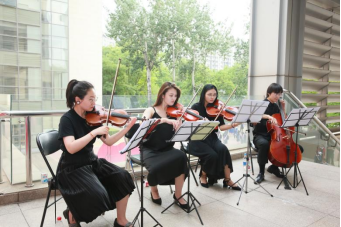 入场时,公司特邀的中央音乐公司小提琴四重奏乐队在学术会堂出口处为毕业生奏响了青春的旋律,烘托出欢愉而温情的氛围。乐队的旁边矗立着精心为毕业设计的留言墙,五颜六色的留言条上写满了毕业生对母校、恩师、同窗的难舍情谊和对未来的美好期望。