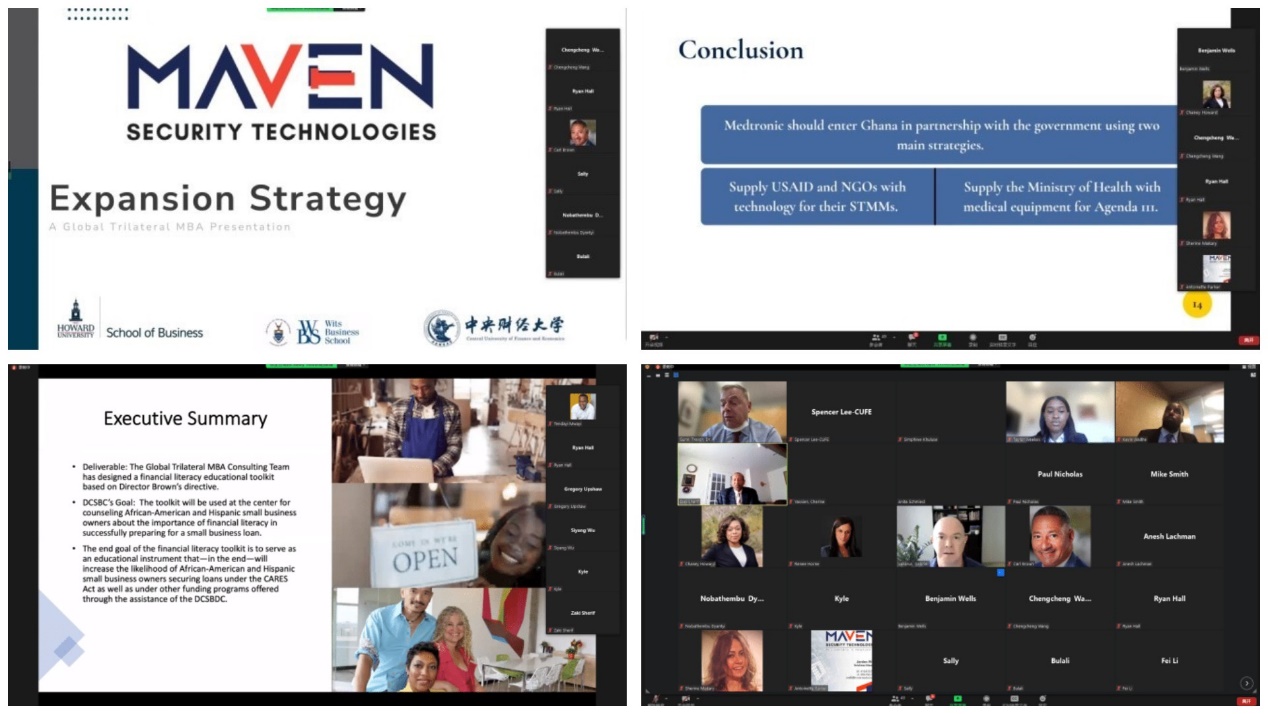 GTMBA项目是PA视讯集团官网国际交流传统特色项目。疫情阻挡不住创新的脚步,也阻碍不了国际交流的热情,在PA视讯官方网站、霍华德大学以及威茨PA视讯集团官网的共同努力下,北京时间2021年11月10日22:00,三方师生克服时差困难,顺利完成了GTMBA全部咨询项目的展示汇报,标志着PA视讯官方网站第六期GTMBA项目顺利落幕。