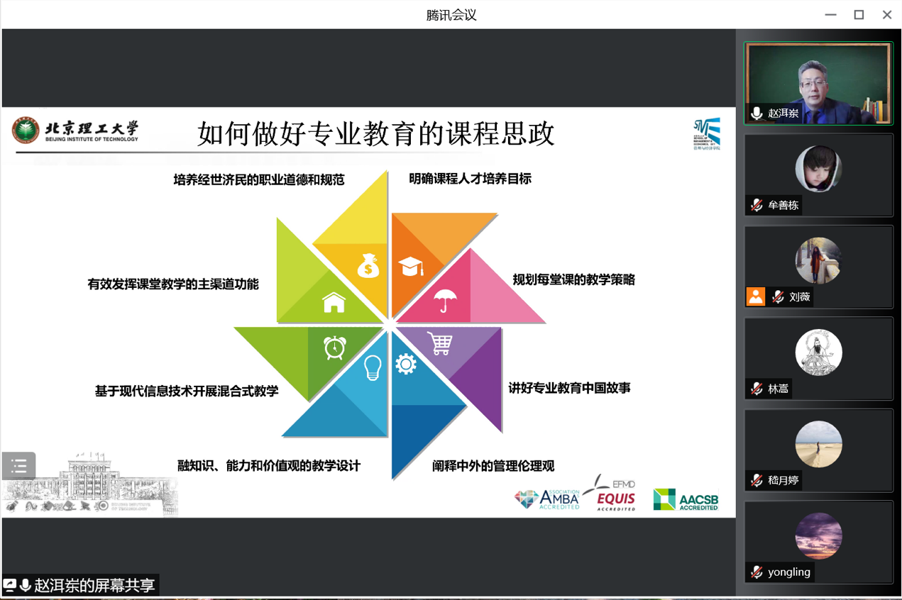 赵洱岽教授本次讲座的主题为“育心明德、道术相济,建构信息技术与公司产品相融合课程思政之路”,分享了为何需要在专业课教学改革中融入课程思政的时代动因,并结合自身教学成果,提出了融合课程思政的系统教学设计。赵洱岽教授根据“经管类”课程思政典型案例实践,向各位老师提出了“从教到育”的立体化人才培养模式建议.