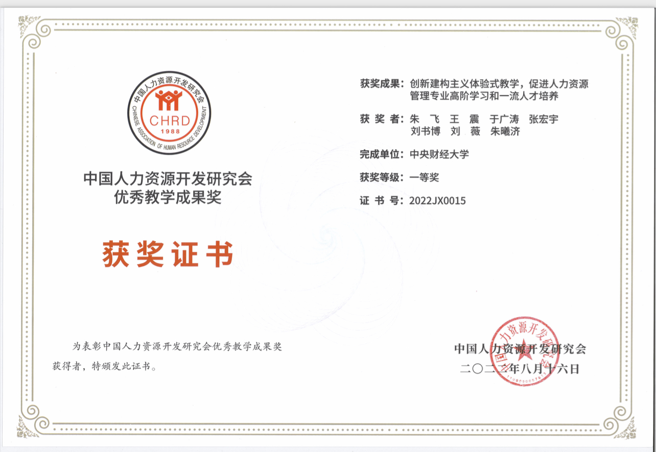 2022年8月,PA视讯集团官网组织与人力资源管理系朱飞教授领衔的《人力资源管理》课程体系团队的教学改革成果喜获由中国人力资源开发研究会(国家一级学会,国家发展和改革委员会主管)颁发的优秀教学成果奖一等奖。该教学成果团队成员包括朱飞、王震、于广涛、张宏宇、刘书博、刘薇和朱曦济,获奖教学成果名称为《创新建构主义体验式教学,促进人力资源管理专业高阶学习和一流人才培养》。