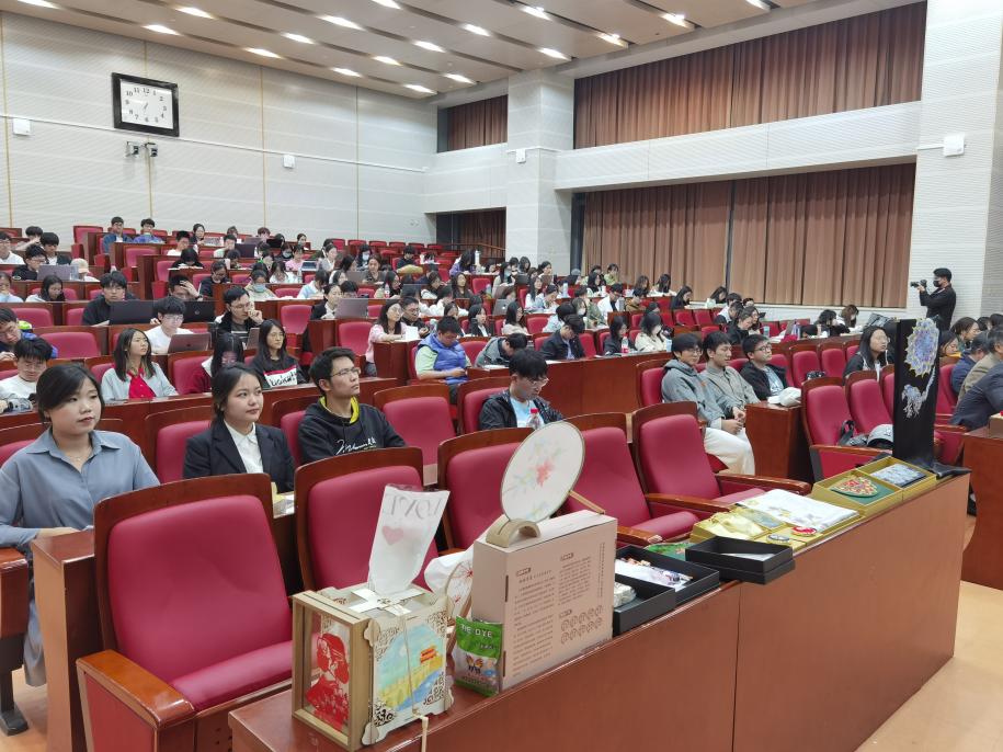 本次讲座不仅有丰富的背景知识讲授和非遗案例介绍,还有实际的操作展示,来自融今文化教育品牌融懿学堂的非遗课程老师,在讲座现场进行了扎染工艺的全流程展示,将劳动的过程与工匠精神直观地传达给同学们。