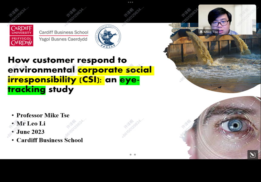 谢教授讲座的主题为“Customer Responses to Environmental Corporate Social lrresponsibility (CSI)on Social Media: An Eye-Tracking approach”。该研究应用眼动跟踪技术研究方法,从消费者的视角,通过设置不同的实验场景,对企业环境责任缺失行为进行了探究。
