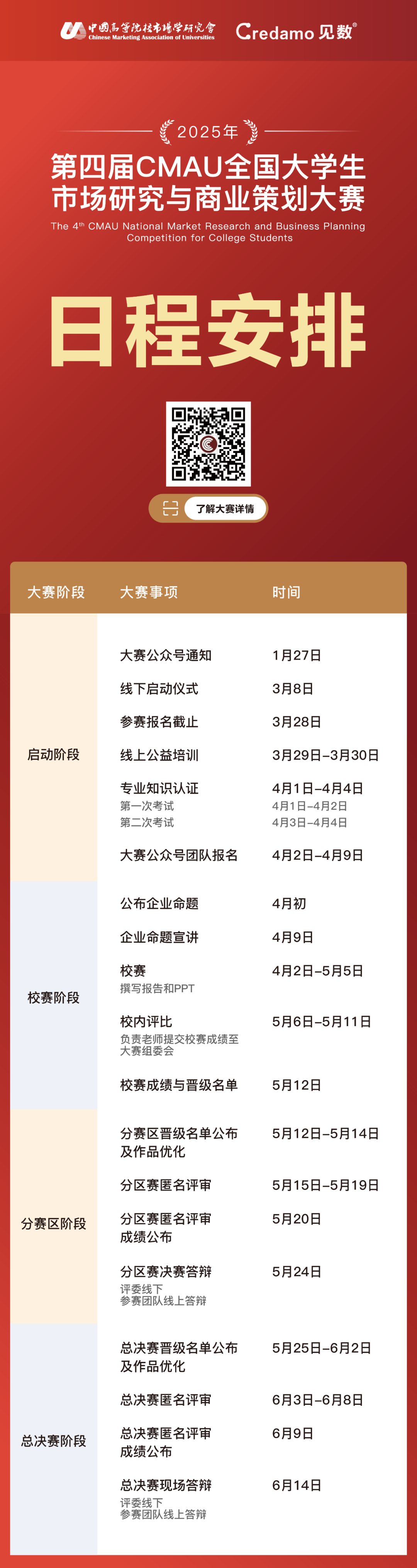 为了给广大师生搭建一个更为丰富的教育实践与技能锻炼平台,进一步推动高校员工的创新能力和实践能力,提高市场研究与商业策划的综合素质,由中国高等院校市场学研究会与Credamo见数联合主办的第四届CMAU全国老员工市场研究与商业策划大赛将于2025年1月正式启动。