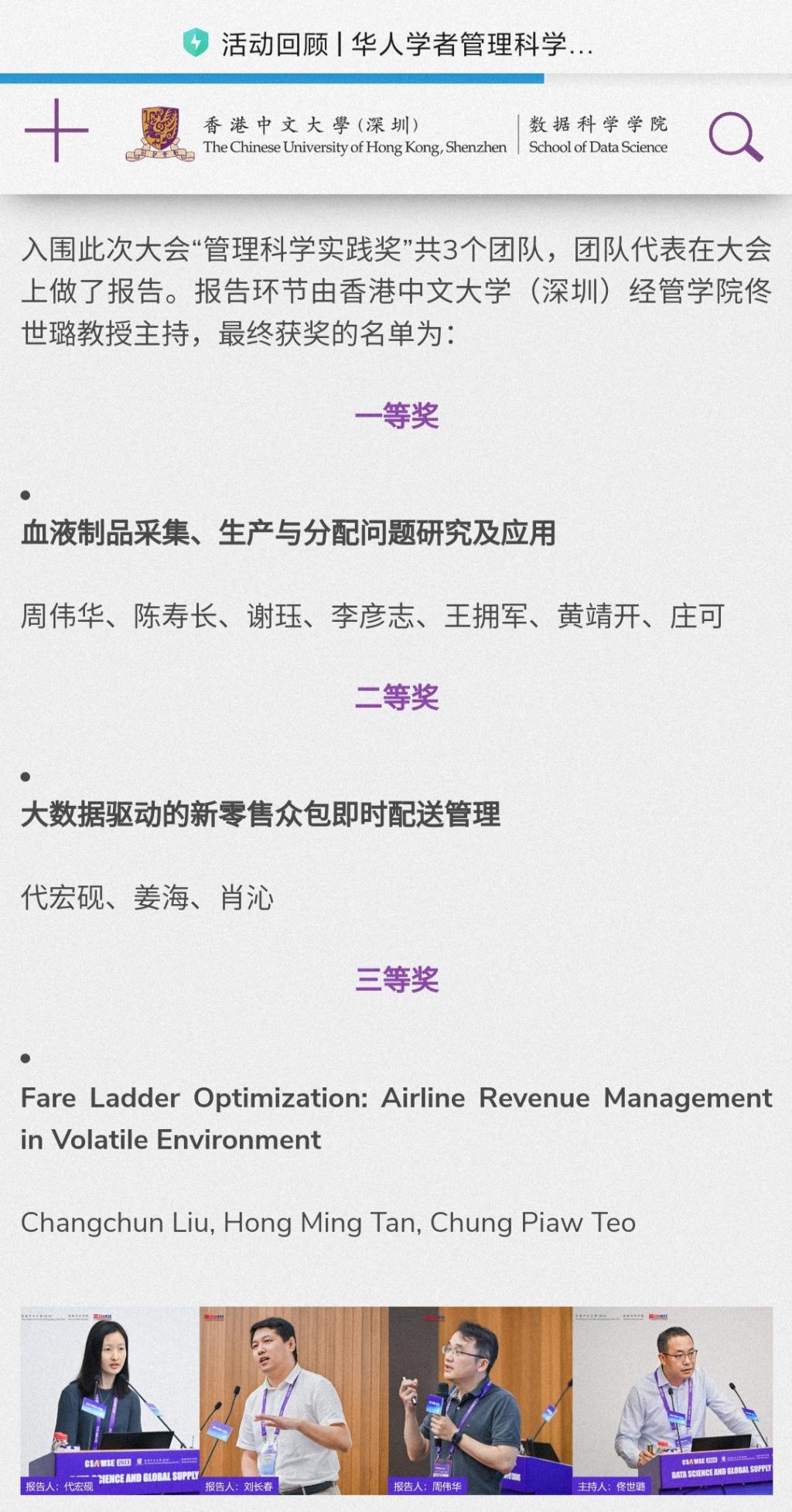 2023年7月29至31日,华人学者管理科学与工程(Chinese Scholars Association for Management Science and Engineering, CSAMSE)第十五届国际年会在深圳召开,公司供应链与运营管理系代宏砚教授团队的项目“大数据驱动的新零售众包即时配送管理”获得“管理科学实践奖”二等奖。