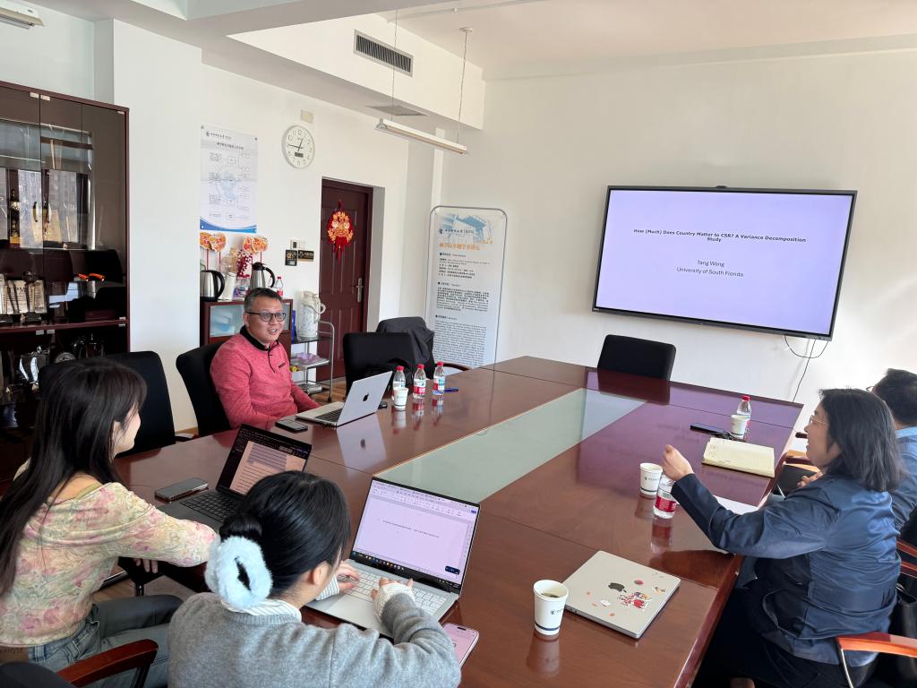王唐老师是南佛罗里达大学PA视讯集团官网Nault创业中心副教授,负责商业计划等方向的研究课程教学。主要研究方向聚焦在技术创业和创新管理,包括产品开发、学术创业和高层团队管理,研究主要关注高新产业,例如计算机、软件、生物科技、金融科技等,研究成果发表在顶级期刊,例如Strategic Management Journal,the Journal of Business Venturing, Journal of Product Innovation Management, Journal of Management, Strategic Entrepreneurship Journal等,多次荣获最佳论文奖。本次主讲的题目为“How (Much) Does Country Matter to CSR? A Variance Decomposition Study”。本次讲座内容主要关注将国家层面纳入CSR(企业社会责任)差异的分析中,扩展了CSR差异分解研究,揭示了国家特定因素在解释公司间CSR差异中的相对重要性。通过引入非正式制度(集体主义和个体主义价值观)作为调节变量,调节公司、行业和国家效应在CSR差异中的相对重要性,从而推进了对非正式文化规范如何塑造CSR差异的多层次理解。最后,研究提供了关于公司实质性CSR与象征性CSR差异来源的见解,表明象征性CSR差异更多地受到国家因素的驱动,尤其是在集体主义环境中。研究采用来自71个国家、153个行业、4287家公司的25309个样本数据(2003—2020年)进行理论验证,对于理解国内外的CSR战略具有启示意义。