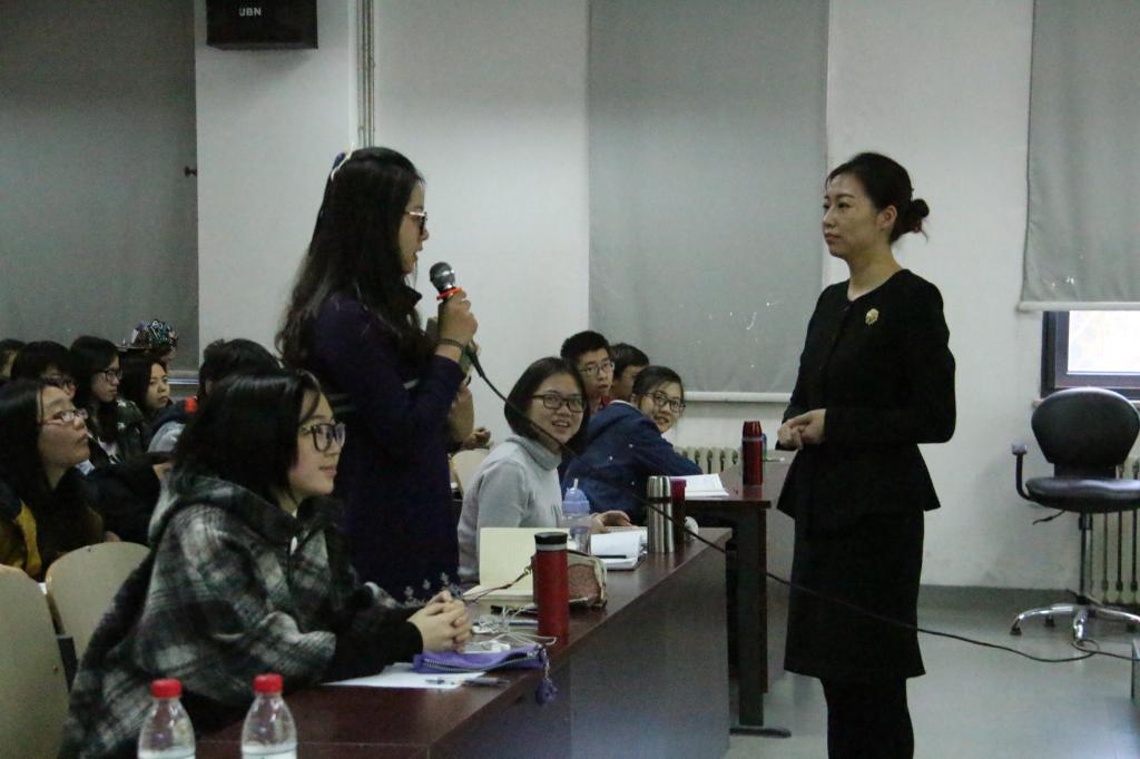 讲座伊始,董惜如老师身着标准职业装走进教室,以幽默的语言和优雅的谈吐吸引了在场观众的注意,她首先以一张风趣的图片向大家展示了“女屌丝”与女神的区别,让大家深切地体会到礼仪素养在现今人际交往中的重要性,现场的气氛瞬间活跃了起来,讲座也在掌声中开始。紧接着董老师向学员们展示了一段视频,提议大家以小组为方式讨论,找出视频中的不合礼仪之处,在激烈的讨论过后,学员们争相发表自己的观点,在董老师的引导下逐一指出了其中失礼之处,这样的课堂互动极大程度的调动了课堂氛围,为学员生动形象地阐释了注重礼仪的必要性、赢得形象的服饰搭配方法以及商务礼仪的具体内容。随后,董老师深入浅出,分别从男女商务套装的不同要求、不同场合的介绍礼仪以及迎送和列席礼仪规范等方面,给出了非常切合实际的建议,并且亲自做了示范,着重从“握手”、“站姿”、“坐姿”等细节方面具体讲解,在声情并茂讲解的同时,还与同学进行了现场的互动,使讲座现场的气氛更加热烈,让学员们直观地感受到了商务礼仪在人际交往中的魅力所在。