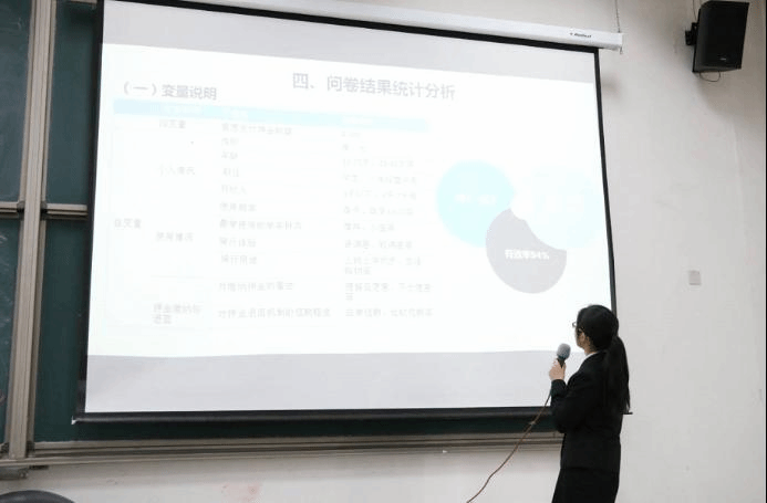 第二组同学则以信息化时代老员工就业和企业招聘的双向博弈为市场调研的主题,从研究背景、研究思路、调查实施过程、结论与建议几个方面介绍了整个小组成果。