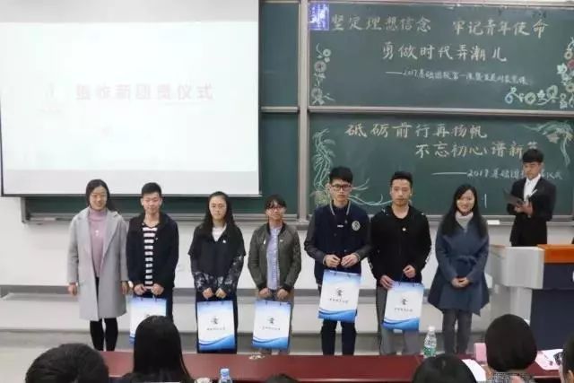 新生团员是此次基础团校培训的重点,2017年9月,公司团委接收了246名新生团员,成立了7个新生团支部。为了加强新生团支部建设,举办了接收新生团员仪式。由优秀团员代表为新生团员代表佩戴团徽,研究生会主席马雅璇与17-1班芮+导师潘昊宁向新生团支部发放“薪火相传”团务工作资料包。