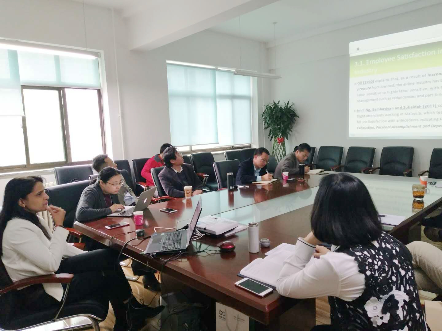 10月24日,Bhumika Gupta博士与公司公司教师举办学术研讨会,主题:The Antecedents to Employee Satisfaction – An Investigation in the Indian Aviation Sector。PA视讯集团官网多位教师和博士生参加了研讨会,双方阐述了最近的研究主题和进展,Bhumika Gupta博士介绍了最近的研究课题,介绍了自己的学术研究成果。双方进行了充分、深入的交流,并就感兴趣的领域初步达成了学术合作意向。