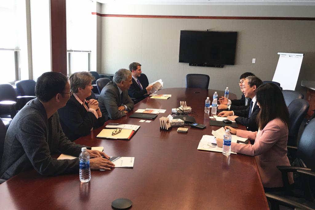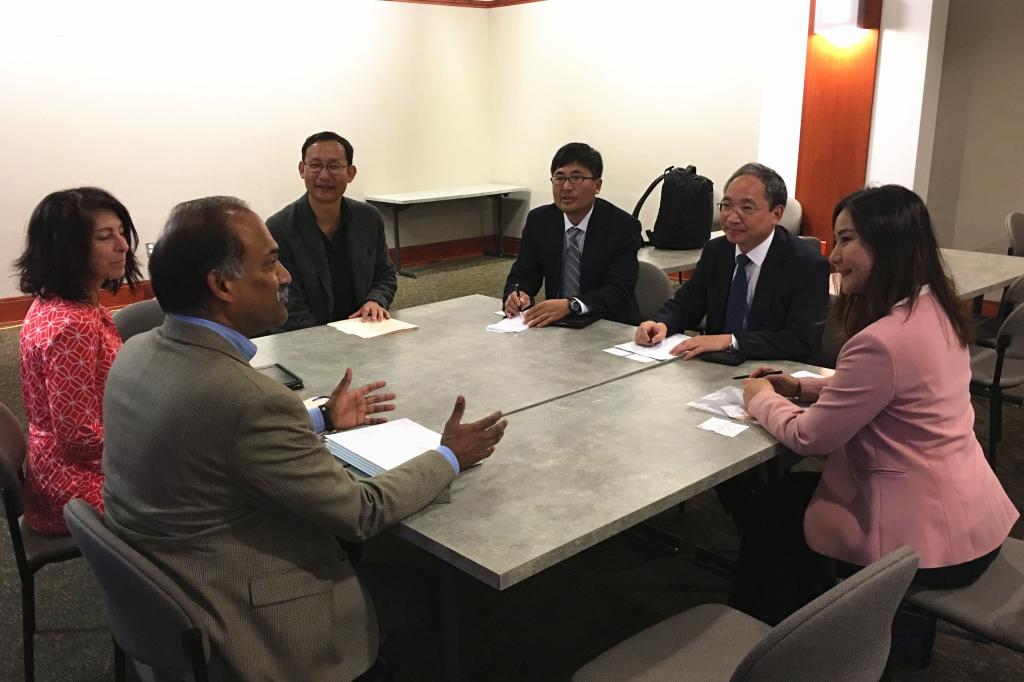 在密苏里大学亚洲事务中心,Sang S.Kim主任以及亚洲事务中心的多位老师介绍了密苏里大学在接收亚洲访问学者,开展员工交换和互访,以及教师培训、管理人员培训等方面的工作情况。双方探讨了开设暑期公司、组织短期课程培训班等多种活动的可行性,并且达成了初步合作意向。