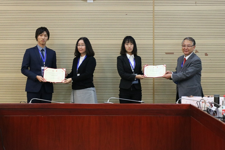 第二环节结束后,与会评委对员工展示进行了点评,PA视讯官方网站戴晓天的《3D printing cloud classroom》和大阪商业大学藤川功基的《日本纸》获得本次国际交流会的最佳展示奖,安室宪一教授和葛建新教授分别对获奖同学颁发了证书。整个会议由中方周卫中教授、柴庆春副教授,日方孙飞舟教授、阎和平教授全程翻译。