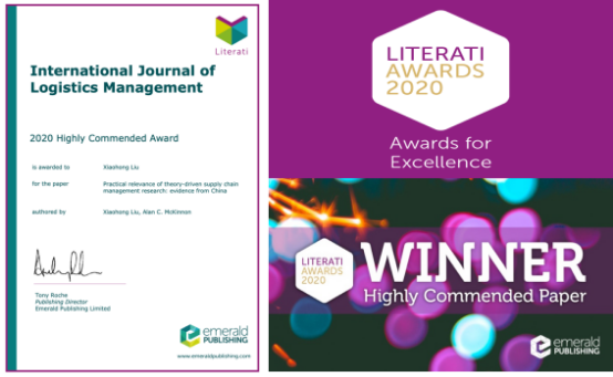The Emerald Group announced the results of the 2020 Emerald Literati Awards for Excellence. The paper "Practical relevance of theory-driven supply chain management research: evidence from China" by Professor Liu Xiaohong of CUFE Business School as the first author (and corresponding author) published in "The International Journal of Logistics Management" won the 2020 Emerald Literati Highly Commended Award. (Liu, X. and McKinnon, A. (2019). Practical relevance of theory-driven supply chain management research: evidence from China.International Journal of Logistics Management (SSCI), Vol. 30No.1, pp.76-95. DOI:10.1108/IJLM-12-2017-0337)