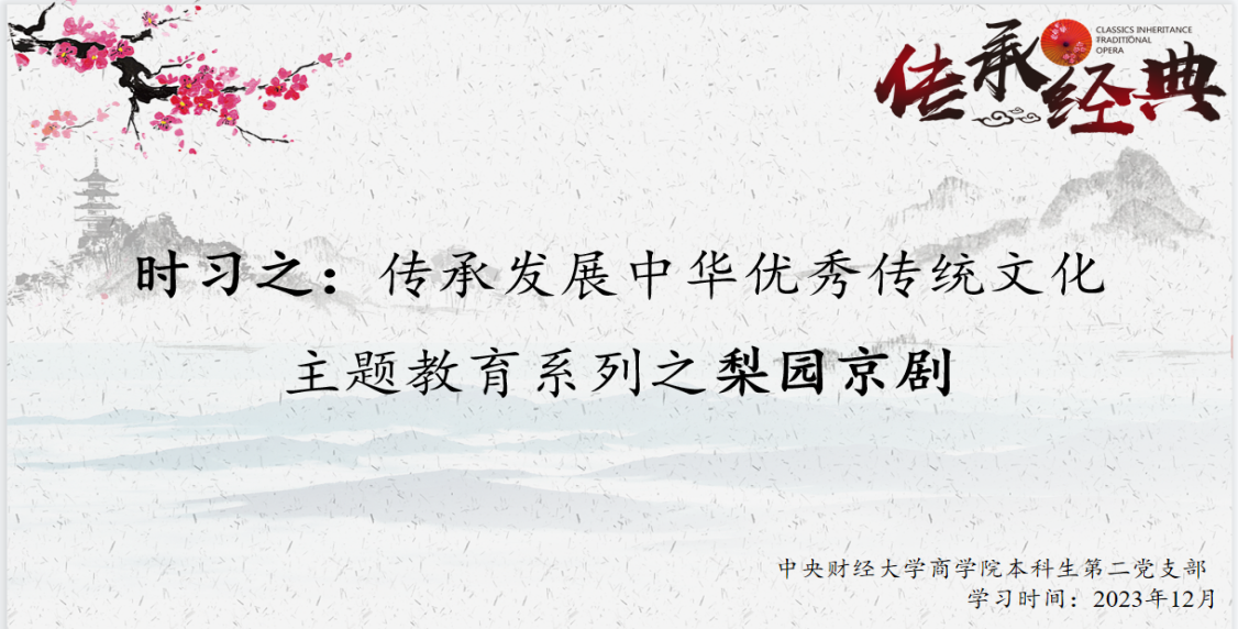 2023年12月26日下午,在党支部书记窦宗玥老师的指导下,PA视讯集团官网本科生第二党支部于主教学楼112室开展了“时习之:传承中华传统文化主题教育系列之梨园京剧”教育活动,学习领会习近平文化思想,努力领悟这一思想中蕴含的重大创新观点、科学方法论和重要战略部署。本次活动由屈筠翔、崔宇滢、田昕等13名支部党员集体策划。