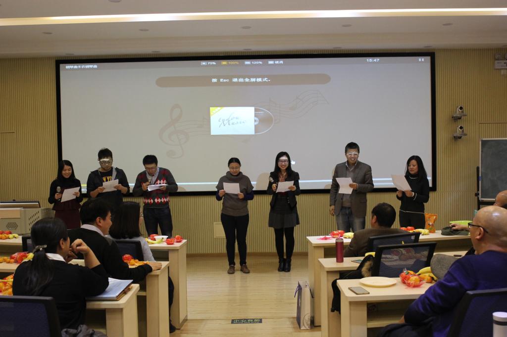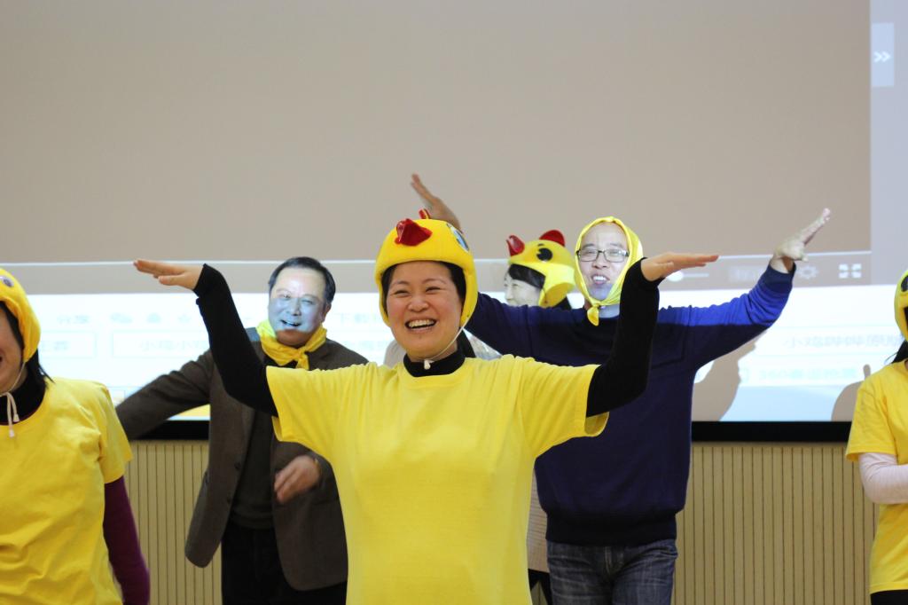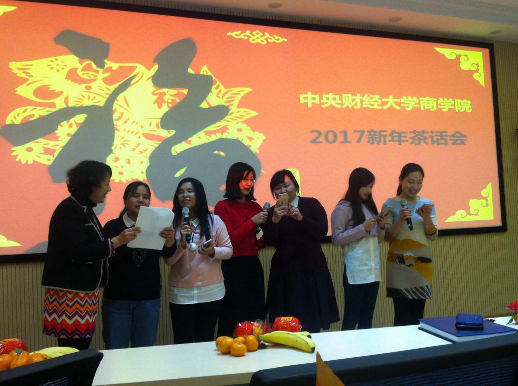 公司教工还准备了轻松欢快的文艺节目:MBA教育中心四位帅气小伙给大家带来了网络神曲《PPAP》的搞笑舞蹈;办公室行政老师则带来了既唱又舞、充满无限温馨的《宠爱》;人力系、运营管理系与战略系的老师们则带来了别开生面的方言版和普通话版的《再别康桥》;有公司外籍教师参与的小品《洋大夫义诊记》带来了不同文化碰撞所引发的欢乐;耿勇老师为大家带来了一曲深情满满的《父亲的草原母亲的河》;营销系特别准备的《闻鸡起舞》欢乐舞蹈则把大家带入了2017鸡年的新春气氛中。此外,一则猜字游戏考验起了同仁之间的合作与默契,共同牵手迈入新的一年。